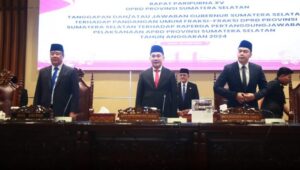 VENEWS Pimpinan dan Anggota DPRD Sumsel kembali menggelar rapat paripurna ke-1XV lanjutan guna mendengarkan jawaban Gubernur terhadap Pandangan Umum Fraksi-Fraksi atas Ranperda tentang Pertanggungjawaban Pelaksanaan Anggaran Pendapatan dan Belanja Daerah (APBD) Sumsel Tahun 2024, Senin (16/6/2025). Pada sesi ini DPRD Sumsel menyatakan dapat menerima laporan pertanggungjawaban tersebut dengan beberapa catatan.