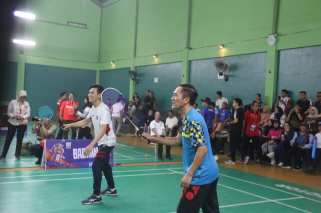 kekuatan Walikota Palembang dalam pertandingan bulu tangkis persahabatan. Aksi adu smash dan rally ini berlangsung sebagai bagian dari rangkaian acara silaturahmi di sela-sela agenda Korpri.