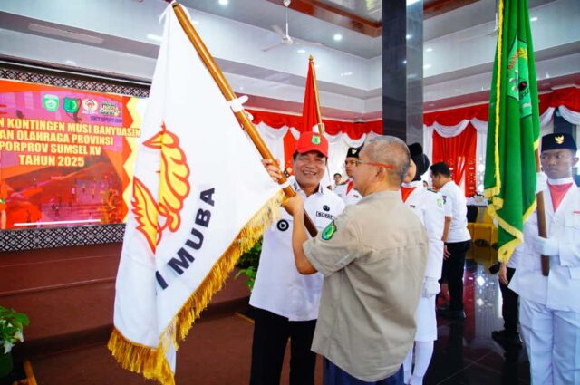 VENEWS, — Bupati Musi Banyuasin (Muba) H M Toha Tohet SH bersama Wakil Bupati Kyai Rohman secara resmi mengukuhkan dan melepas Kontingen Kabupaten Muba yang akan berlaga pada Pekan Olahraga Provinsi (Porprov) Sumatera Selatan ke-15. Prosesi pengukuhan berlangsung di Pendopoan Griya Bumi Serasan Sekate, Sekayu, Rabu (15/10/2025).
