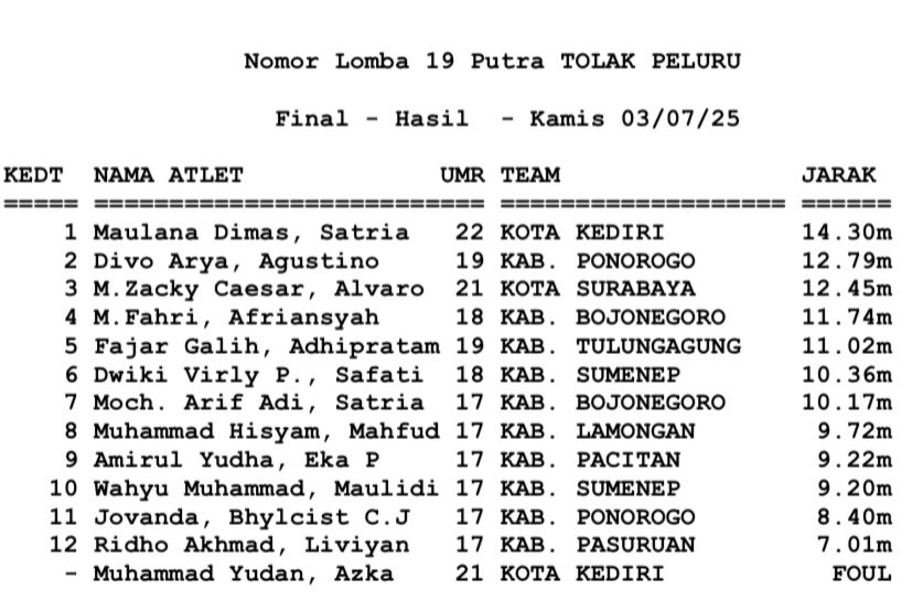 Namun, berdasarkan data resmi dari Porprov Jawa Timur ke-IX yang baru saja digelar, nama yang sama tercatat sebagai atlet kontingen Kota Kediri dan bahkan meraih medali emas dengan lemparan sejauh 14,30 meter.