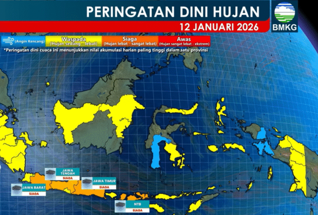 VENEWS Badan Meteorologi, Klimatologi, dan Geofisika (BMKG) mengingatkan masyarakat untuk meningkatkan kewaspadaan terhadap potensi hujan lebat hingga sangat lebat yang diprakirakan terjadi di sejumlah wilayah Indonesia pada Senin, 12 Januari 2026, khususnya di Jawa Barat, Jawa Tengah, Jawa Timur, dan Nusa Tenggara Barat (NTB).
