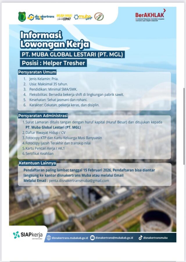 VENEWS – Pemerintah Kabupaten Musi Banyuasin melalui Dinas Tenaga Kerja dan Transmigrasi (Disnakertrans) kembali membuka pintu peluang bagi masyarakat lokal. Berdasarkan kerja sama dengan PT. Muba Global Lestari (PT. MGL), putra-putri terbaik Bumi Serasan Sekate kini mendapat kesempatan emas untuk berkarir sebagai tenaga kerja profesional di sektor industri kelapa sawit.
