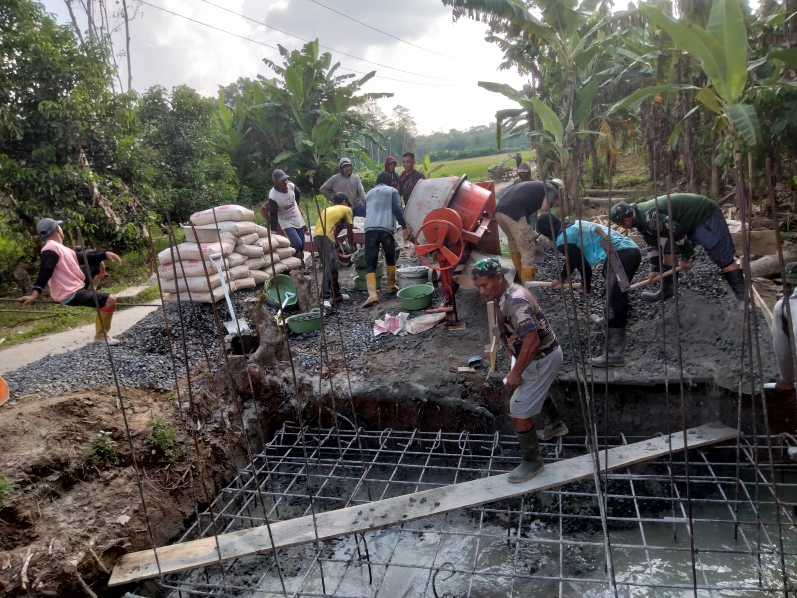 VENEW Semangat gotong royong terlihat di Desa Mengulak, Kabupaten OKU, Sabtu (24/04/2026). Para Personel Kodim 0403/OKU bersama warga setempat saling bekerja sama melaksanakan tahap awal pembangunan jembatan gantung dengan fokus pekerjaan saat ini meliputi penggalian pondasi, distribusi material secara swadaya, hingga pemasangan bekisting mal dan pengecoran pondasi jembatan. Sinergi antara TNI dan rakyat ini menjadi kunci percepatan pembangunan infrastruktur vital di wilayah tersebut._